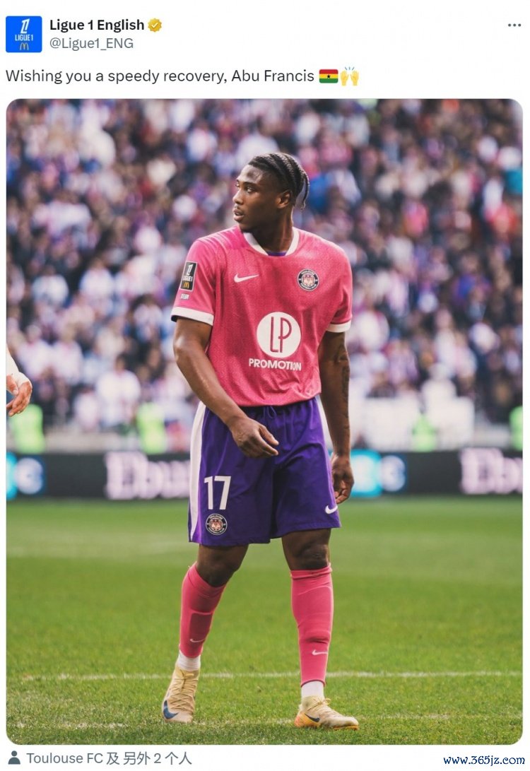 11月14日讯 法甲官方更新社媒动态,祝效力于图卢兹的加纳中场球员阿布·弗朗西斯早日复健 。