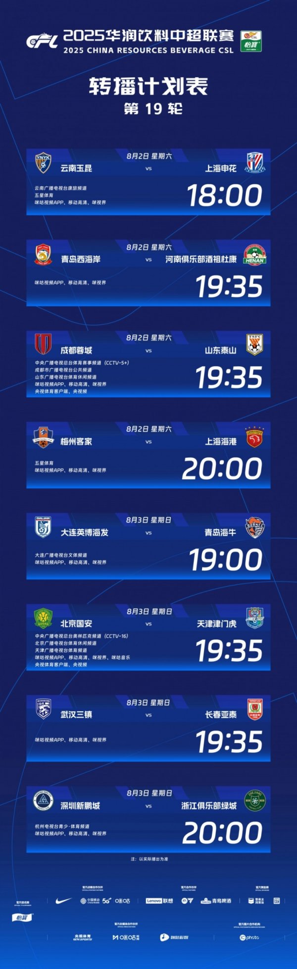 8月1日讯 中超职业联赛 官方公布了第19轮的赛事转播情况网球投注直播平台,其中成都蓉城vs山东泰山、北京国安vs天津津门虎这两场赛事 央视将进行直播。 本轮央 ...