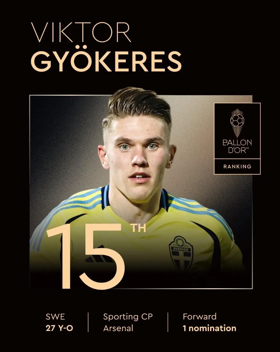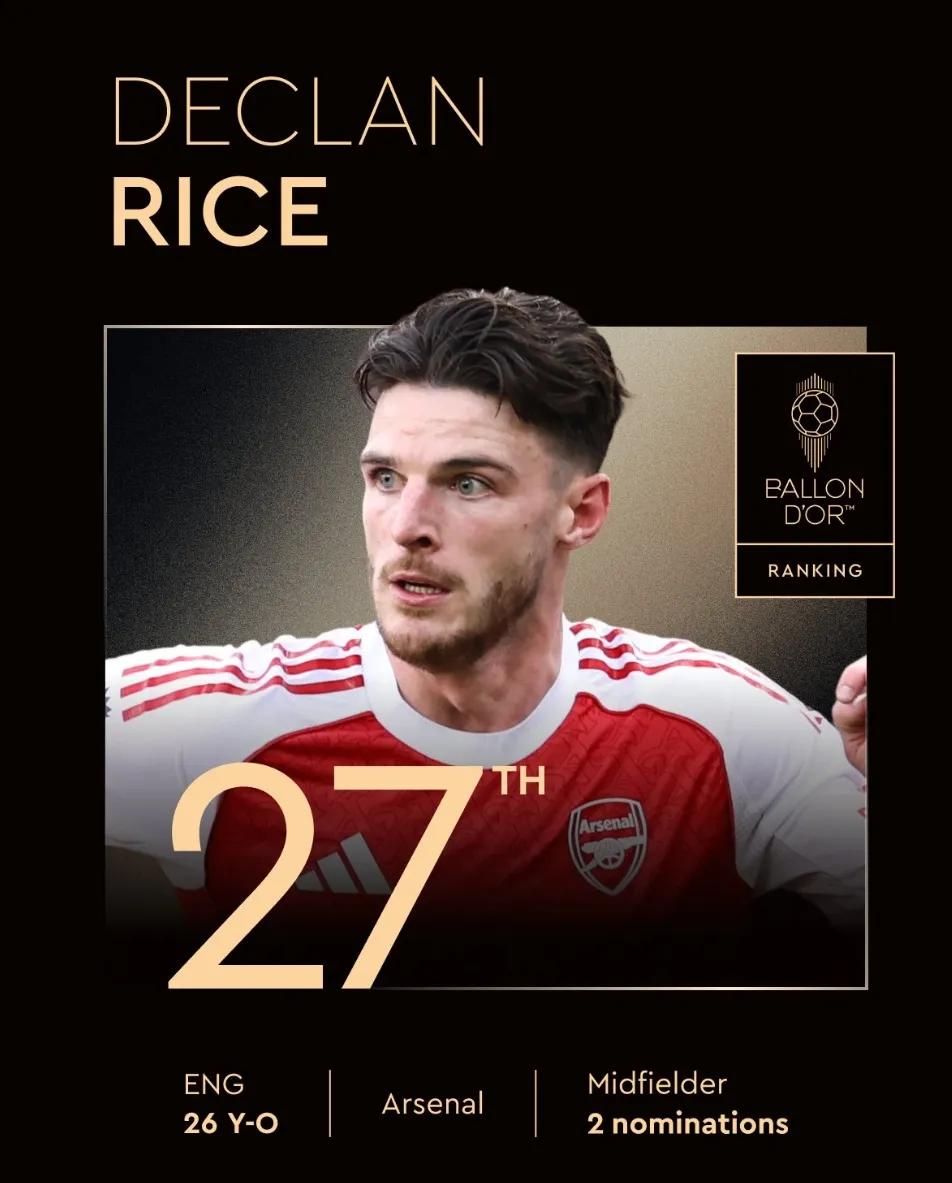 其中,女足金球奖评选中,阿森纳有4人跻身前10,另有3人跻身前30;在男足金球奖评选中,赖斯和哲凯赖什均跻身前30,其中哲凯赖什第15位,赖斯第27位。