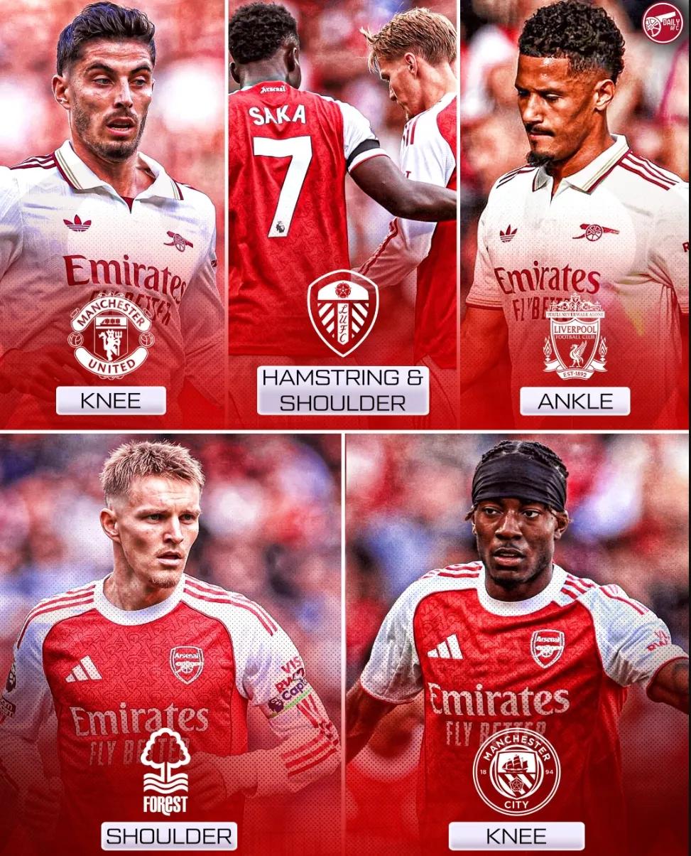 对曼联哈弗茨负伤 ,对利兹联萨卡和厄德高负伤 ,对利物浦萨利巴负伤 ,对诺丁汉森林厄德高再伤,对曼城马杜埃凯负伤 。