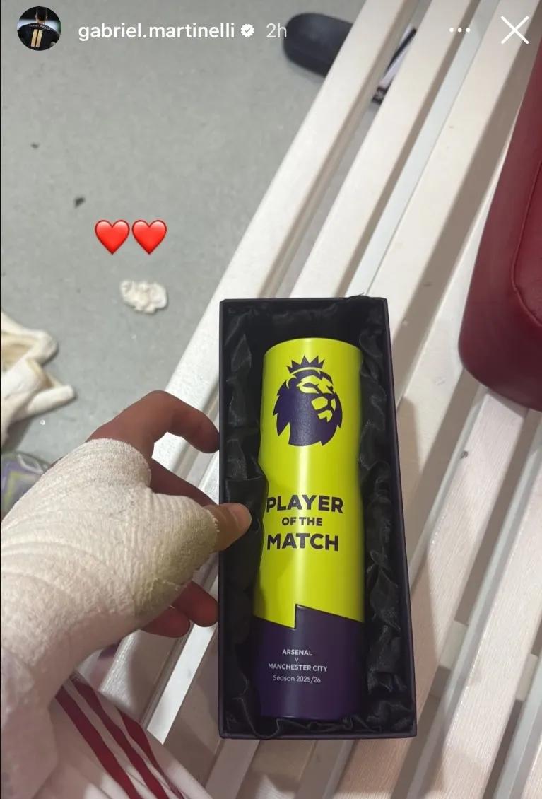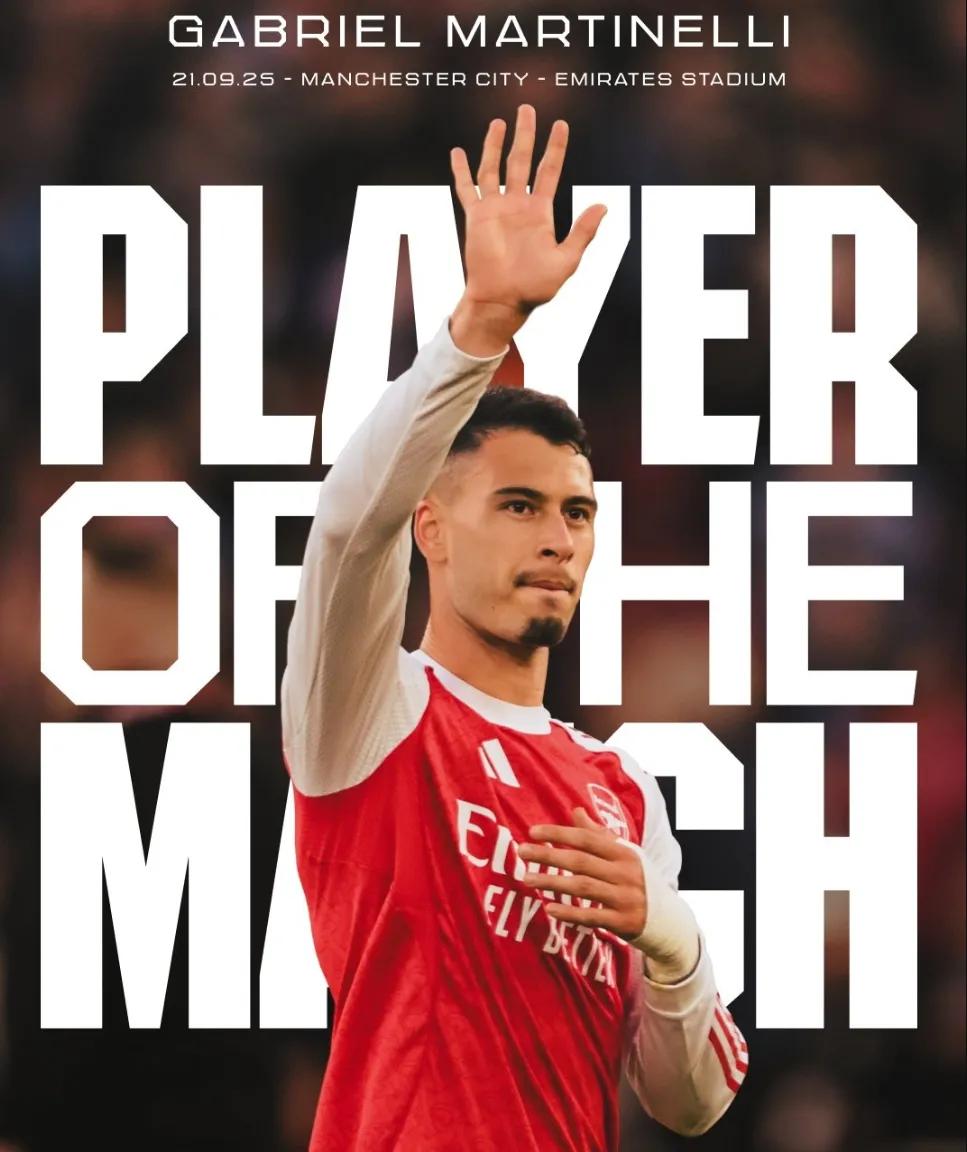 马丁内利被阿森纳官方票选为了对曼城一役的全场赛事 最佳球员!