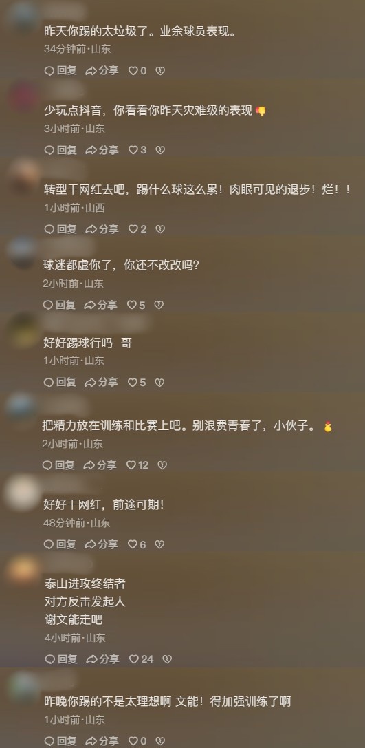 10月5日讯 在昨晚结束的中超职业联赛 第26轮补赛中,山东泰山1-1战平云南玉昆。本场泰山队一些球员的表现引起争议,球迷也在谢文能短视频账号中留言表达了不满。