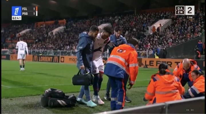 10月30日讯 法甲第10轮,巴黎对阵洛里昂。杜埃冲破 中倒地,表情十分痛苦,苏超直播在线观看最后被担架抬出场。