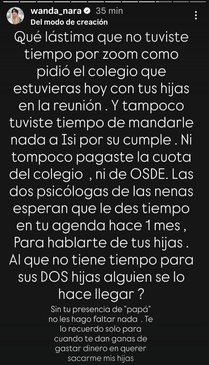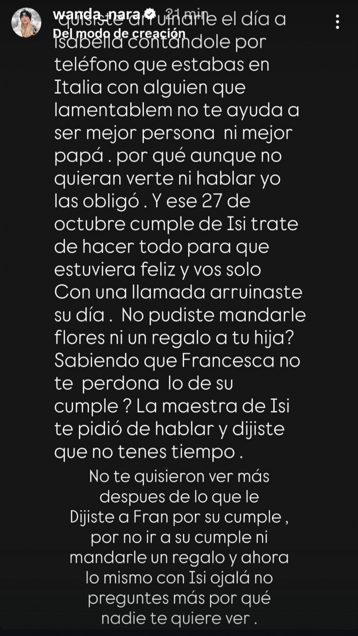 11月01日讯 伊卡尔迪前妻旺达·娜拉连续更新两条社媒社媒,批评伊卡尔迪对待孩子的行为。