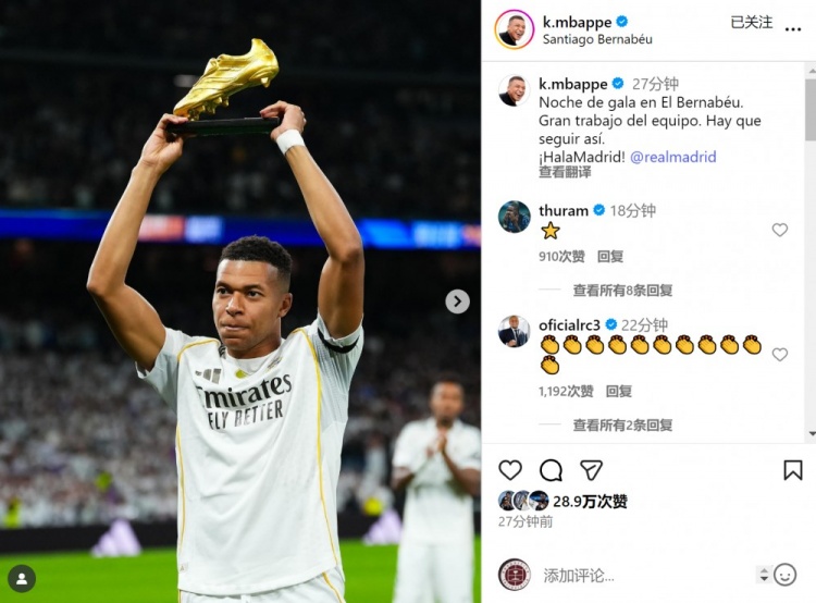 姆巴佩社媒晒出赛前展示欧洲金靴奖杯的照片,苏超直播配文:“伯纳乌的华彩之夜,全队都表现出色,我们要继续保持!Hala Madrid!”
