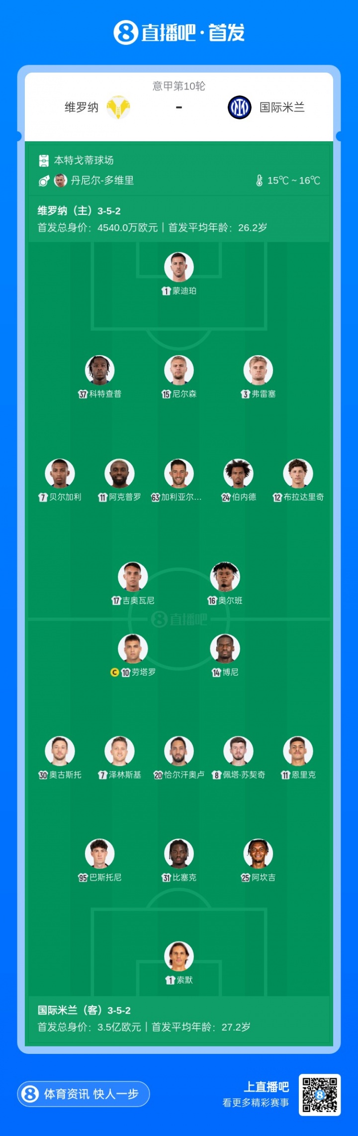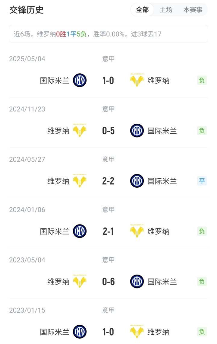 目前意甲积分榜上,国米6胜3负积18分,位列第3;维罗纳5平4负积5分,位列第18。