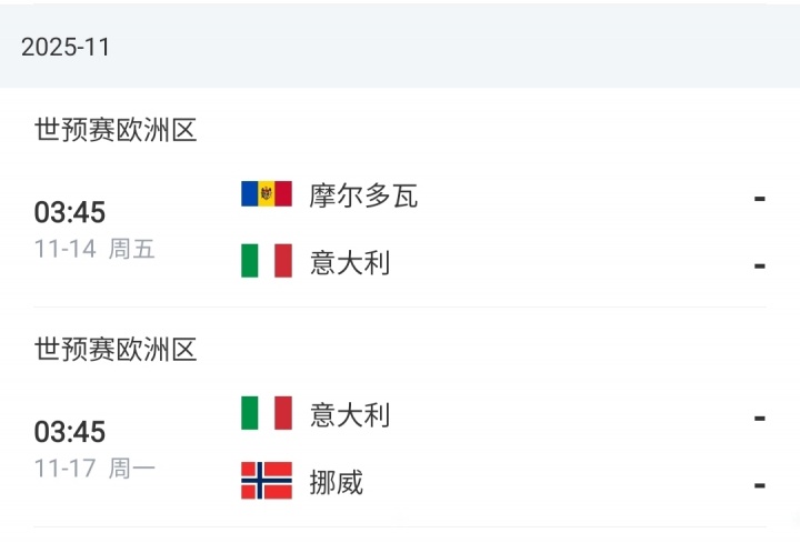 11月07日讯 意大利公布11月世预赛名单,意大利将在本月直接交手挪威,苏超直播目前球队追赶 挪威3分以及16个净胜球。