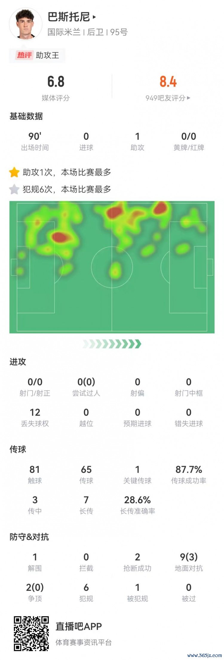 11月10日讯 国米在本轮意甲2-0力克拉齐奥,巴斯托尼本场数据如下: