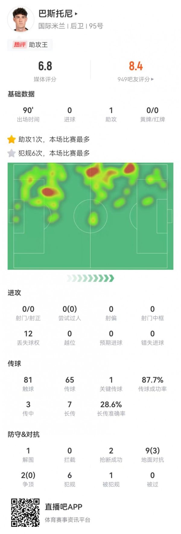 亚洲博彩安全平台 11月10日讯 国米在本轮意甲2-0力克拉齐奥,巴斯托尼本场数据如下: 杆位踢满全场 1助功 12丢失球权 81触球 65传送球 ,成功率87 ...