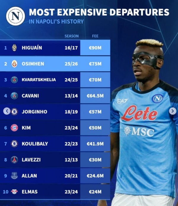 在哪里看足球直播 7月31日讯 奥斯梅恩转会加拉塔萨雷只待官宣,《转会市场》也统计了那不勒斯队史最贵卖人情况,伊瓜因仍居首。 德转列那不勒斯队史卖人榜:欧元 1 ...