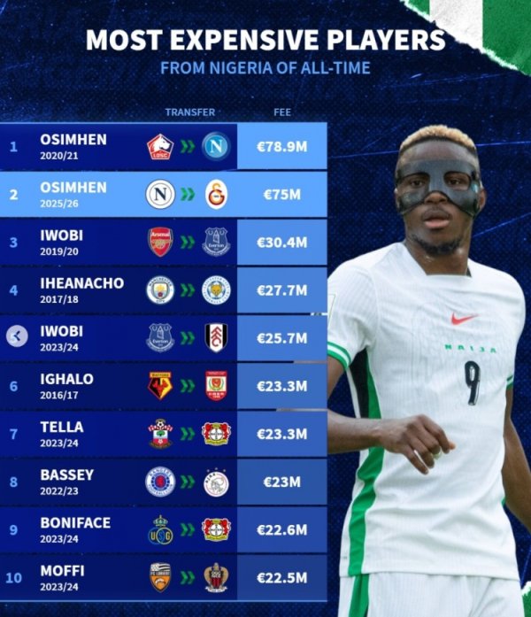 移动投注实时赔率 7月31日讯 奥斯梅恩转会加拉塔萨雷只待官宣,《转会市场》也统计了尼日利亚球员历史转会费榜单,奥斯梅恩独占前二。 德转列尼日利亚球员转会费榜: ...