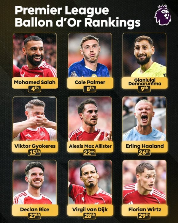在哪里看足球直播回顾 9月23日讯 2025年金球奖排名已经确定,前30中共9名目前在英超效力的球员,英超官方晒出这些球员以及具体排名,萨拉赫第4为英超球员最高 ...