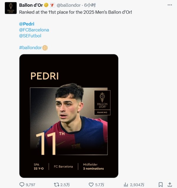 在哪里看足球直播好 09月23日讯 2025年金球奖颁奖典礼在北京时间今天凌晨进行,佩德里仅排在第11位。 在金球奖官方发布的社媒下,佩德里排名11的阅读量接近 ...