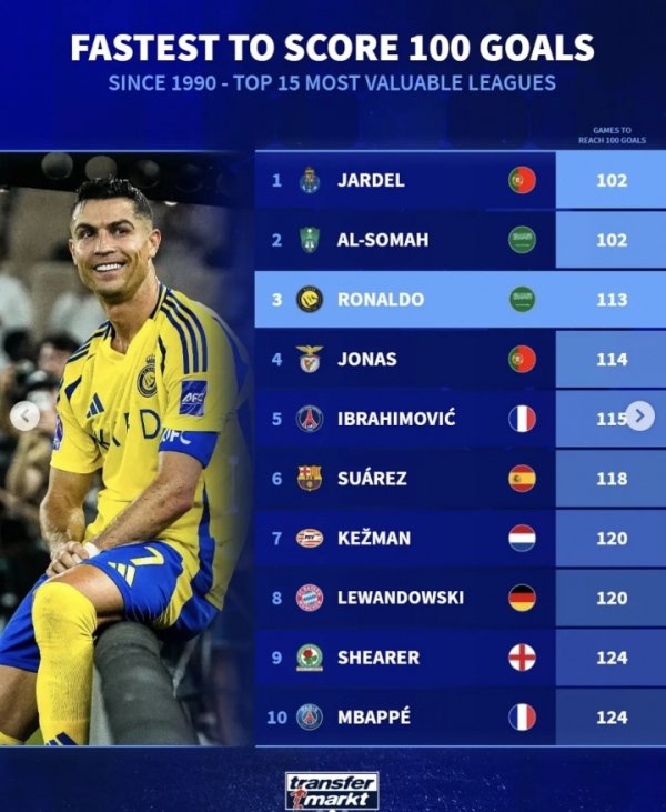 亚洲博彩安全平台 10月26日讯 德国转会市场列出了1990年以来为单支球队攻入100球所需最少场次排名,C罗仅用113场就达成利雅得获胜 100球里程碑,排名 ...